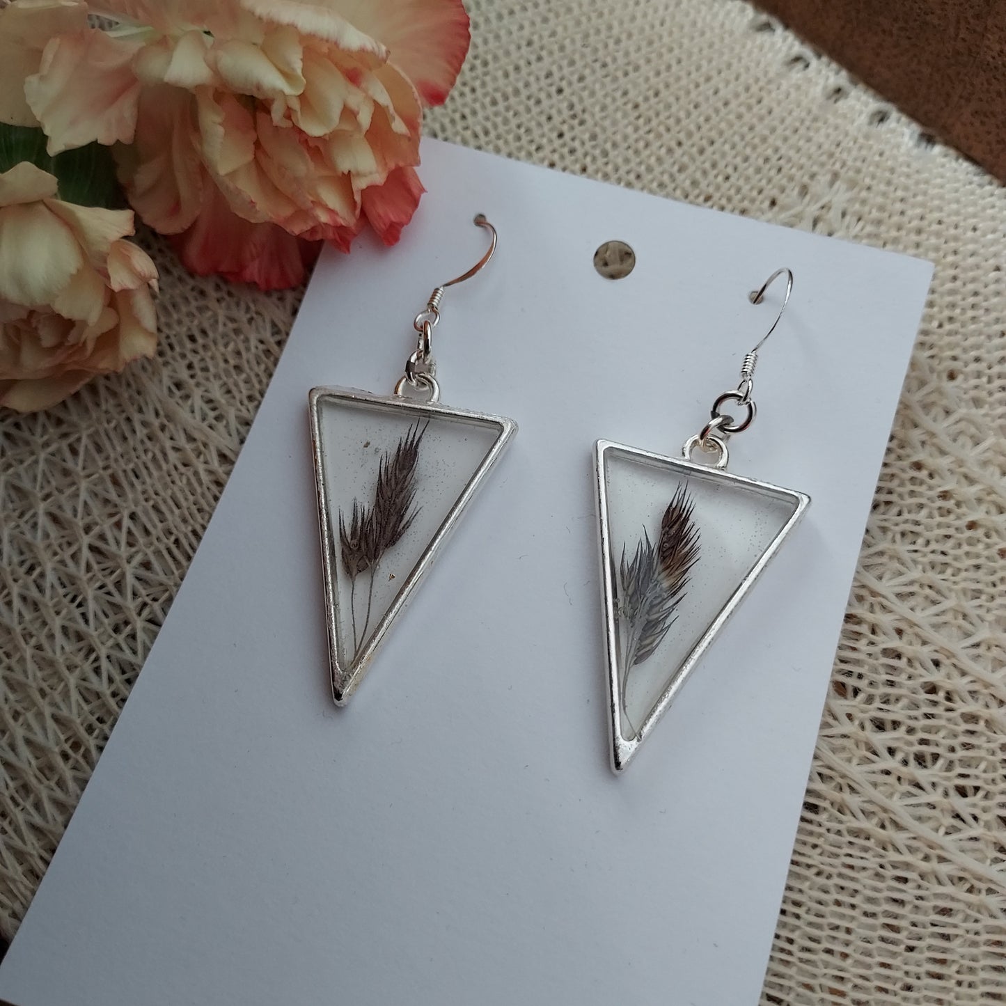 Aito heinä hartsin sisälle säilöttynä. Hopeanväristen kehysten sisällä on läpinäkyvää hartsia, joista valo pääsee kauniisti läpi.