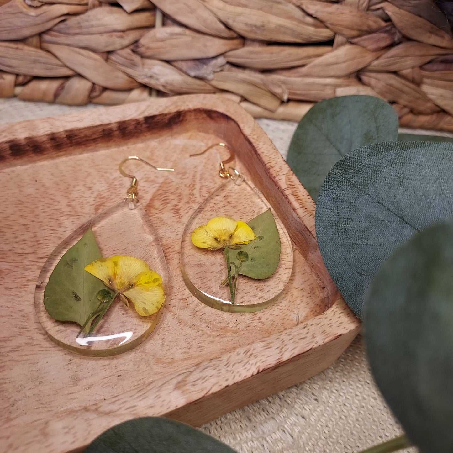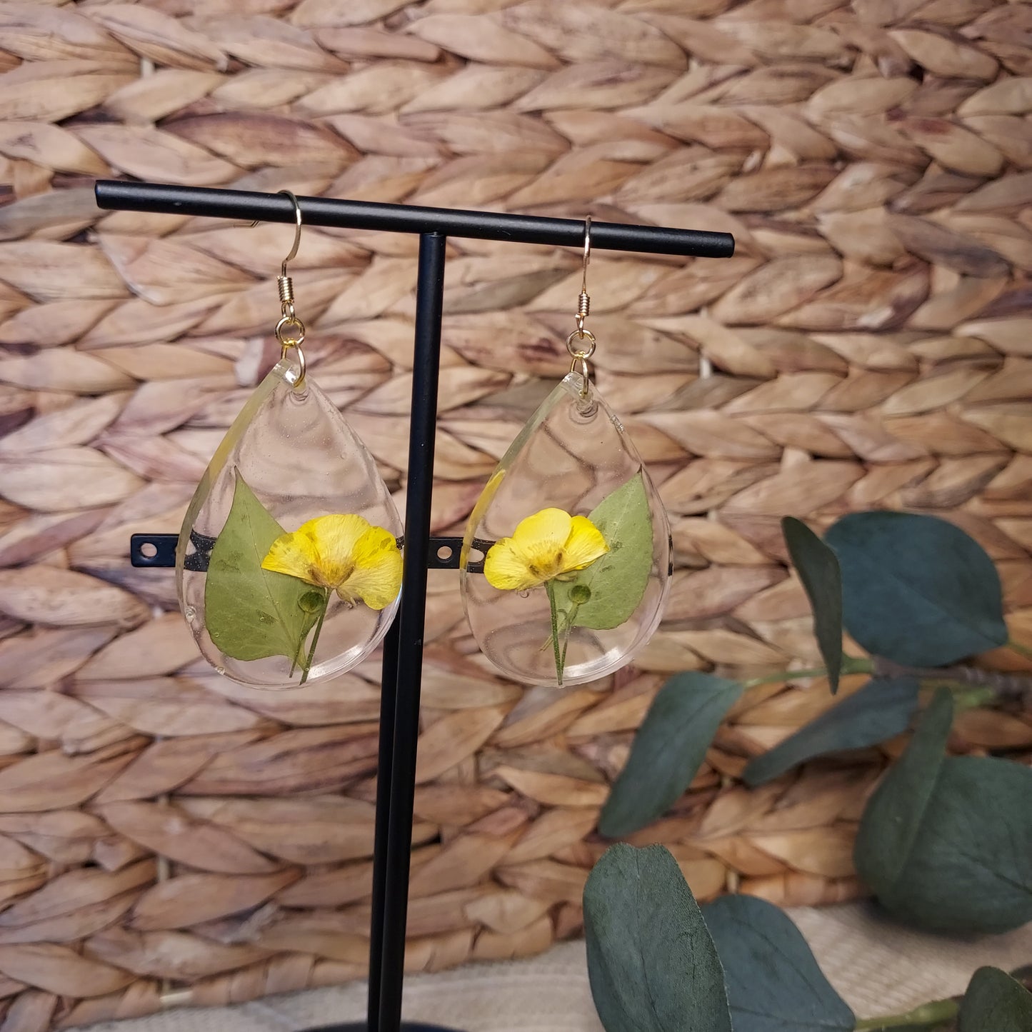 Aidot kasvit läpinäkyvällä hartsilla päällystettyinä korviisi. Korvakorun pituus on 7cm, pisaran levein kohta 3,2cm ja se painaa n.7g. Koruosat ovat kullattua kirurginterästä.