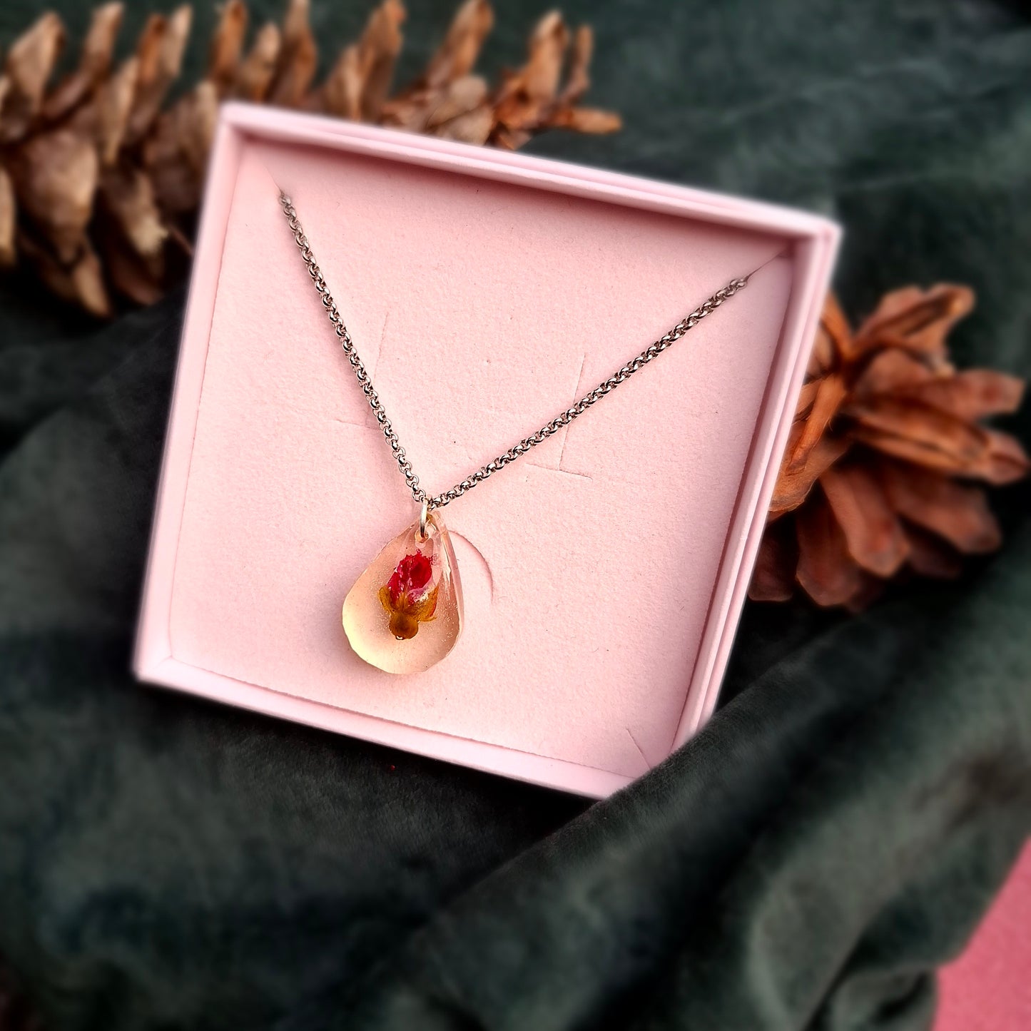 Suloinen pieni ruusunnuppu kauniissa pisaran muotoisessa hartsiosassa. Koruketju on ruostumatonta terästä ja sen pituus on noin 73cm.