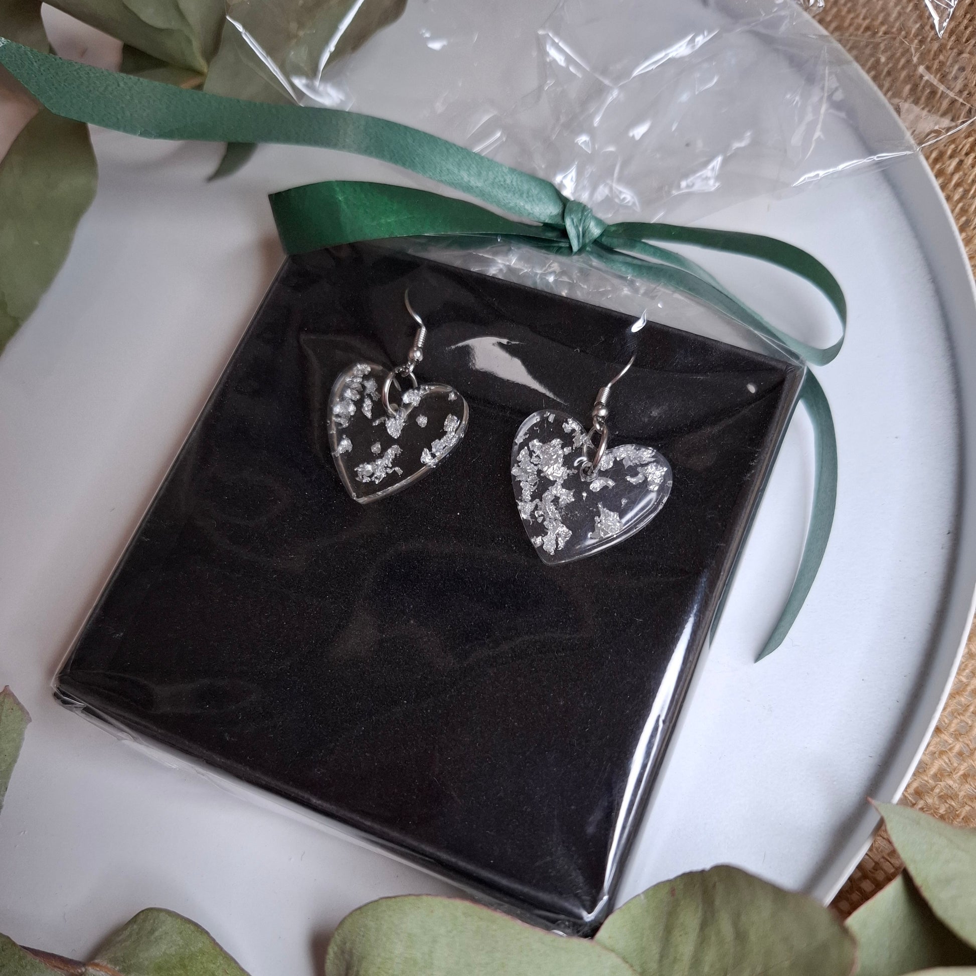 Nämä läpinäkyvät sydämenmuotoiset hartsikorvakorut kätkevät sisäänsä herkkiä lehtimetallin hippuja - kuin pieniä valon pisaroita.